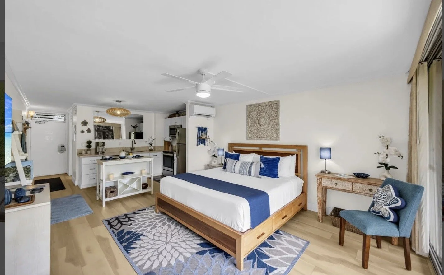 Napili Shores Hideaway is a peaceful garden retreat designed for couples and small families seeking rest and reconnection. Thoughtfully remodeled with soft neutrals, natural textures, and a plush king bed, the space offers effortless indoor-outdoor living just steps from the beach. Ideal for romantic escapes, professional resets, and relaxed stays with one additional guest.